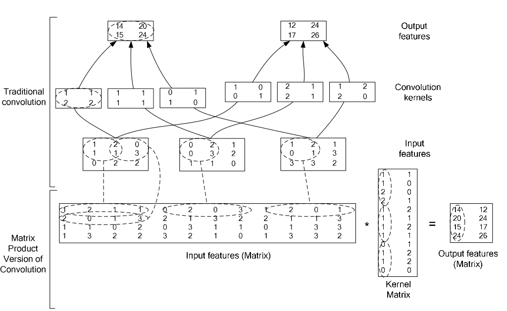 Using im2col to convert the images to a matrix(columns). Computation becomes multiplication pf matrices.